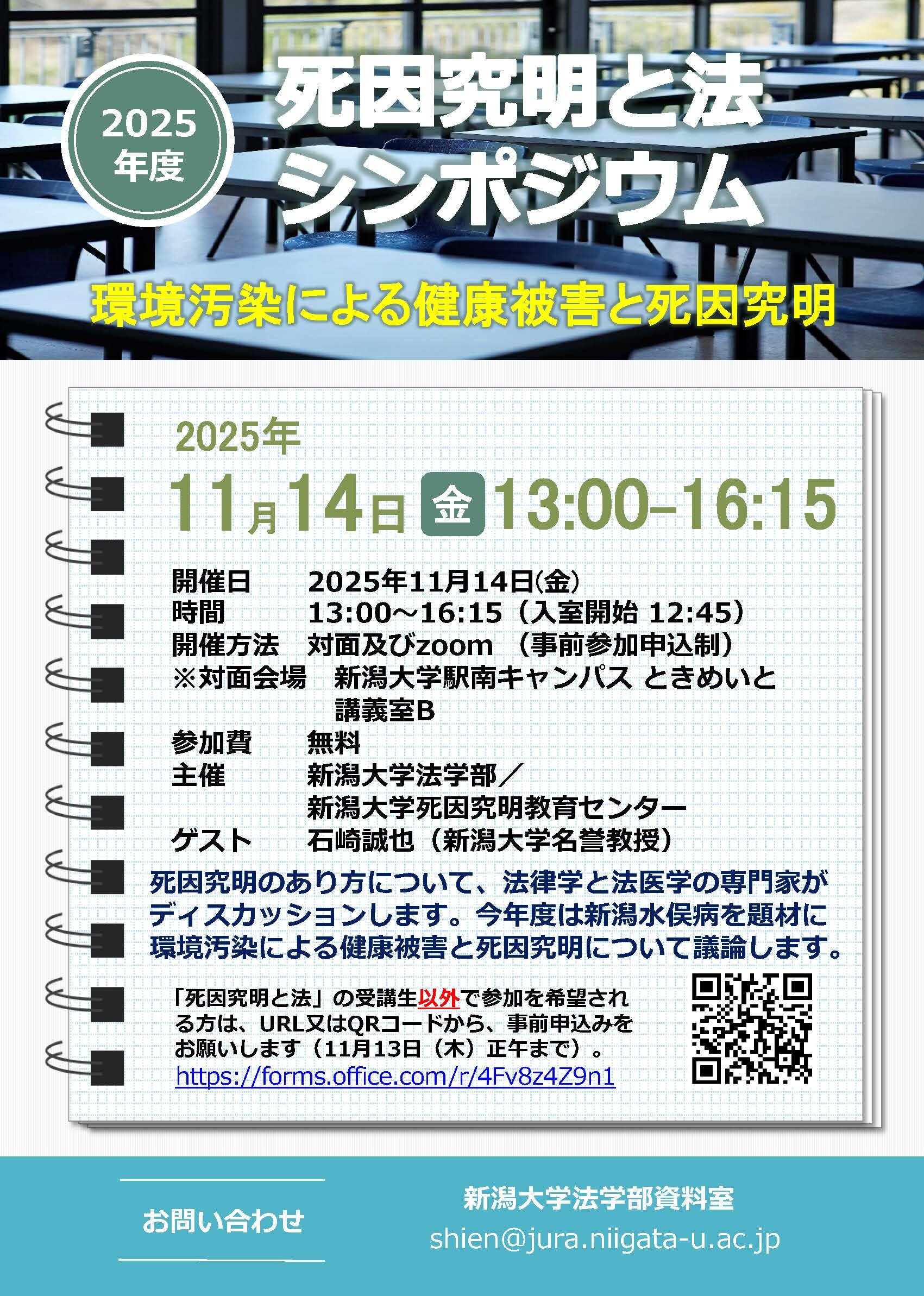 今年度は、新潟水俣病を題材として環境汚染による健康被害と死因究明について、法律学と法医学の専門家がディスカッションを行う予定です。ご関心をお持ちの方は、ぜひご参加ください。