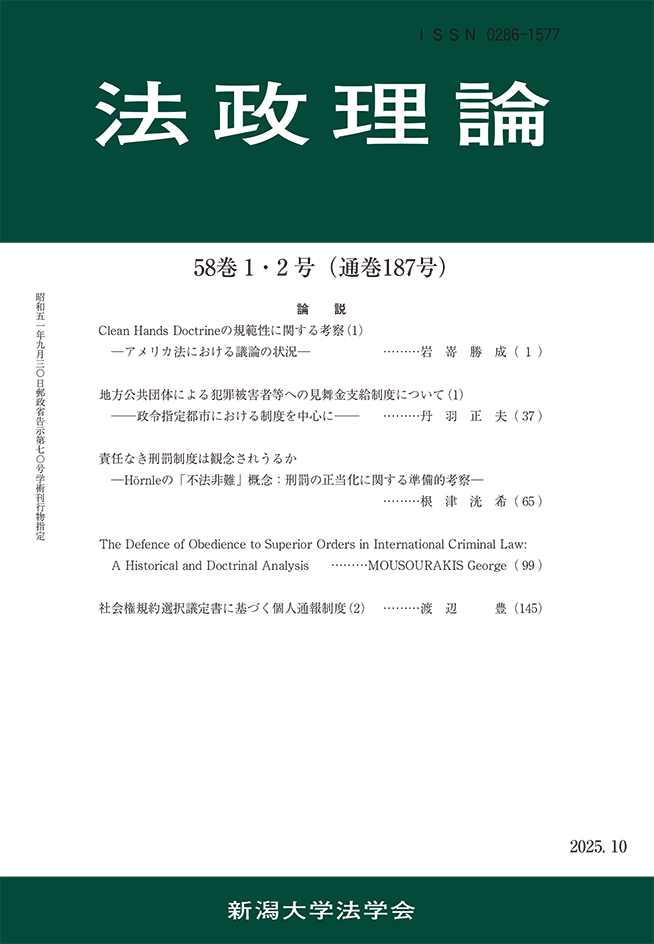 トピックス すべて表示 学生の活躍 教員の活躍 国際交流 先輩の声 留学体験 ゼミ紹介 学生の活躍 令和7年11月10日(月)に、上村ゼミが新潟地方裁判所において裁判傍聴を実施しました。 2025.12.08 教員の活躍 『法政理論』58巻1・2号が刊行されました 2025.12.08 留学体験 ブリストル大学交換留学 2025.11.22 教員の活躍 内田千秋先生の立法紹介が『日仏法学』に掲載されました。 2025.11.20 教員の活躍 宮森征司先生の書評論文が『行政法研究』に掲載されました 2025.11.18 国際交流 「気候変動と法・政治」履修学生による韓国・仁荷大学への訪問が行われました 2025.11.18 学生の活躍 法学部の学生が第2回全国法学部経済法研究フォーラムで発表をしました 2025.11.18 教員の活躍 今本先生の論文が『法律時報』に掲載されました 2025.11.18 1234567891011 >