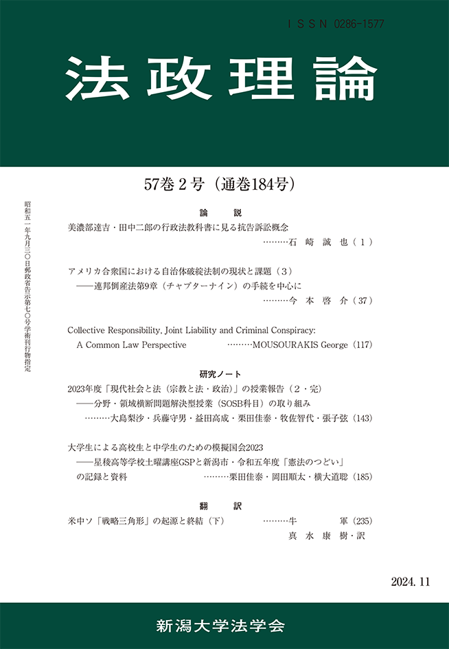 トピックス すべて表示 学生の活躍 教員の活躍 国際交流 先輩の声 留学体験 ゼミ紹介 教員の活躍 今本啓介先生の論文が、『自治総研』に掲載されました 2024.12.09 教員の活躍 今本啓介先生の論文が、『資産評価情報』に掲載されました 2024.12.03 教員の活躍 『法政理論』57巻2号が刊行されました 2024.11.30 学生の活躍 新たな公認学生団体“PUB-Lab”が発足しました 2024.11.27 学生の活躍 10月15日、「賢人会議」で日本弁護士・ニューヨーク州弁護士の服部真吾氏に講義をしていただきました 2024.11.25 学生の活躍 「経済法」履修学生2名が全国法学部経済法研究フォーラムで発表をしました 2024.11.01 国際交流 「気候変動と法・政治」履修学生による韓国・仁荷大学への訪問が行われました 2024.10.25 学生の活躍 法律相談部が無料法律相談会を実施します 2024.10.15 < 345678910111213 >
